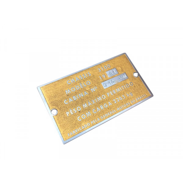 Plaqueta de Identificação da Cabine 3100 Gravação em Baixo Relevo para Chevrolet Brasil 1958 a 1963 3100