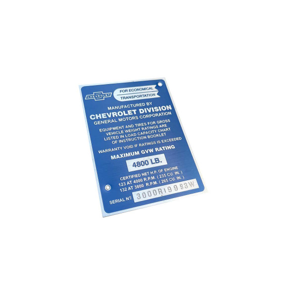 Plaqueta de Identificação para Chevrolet Marta Rocha 3100 1955 a 1959