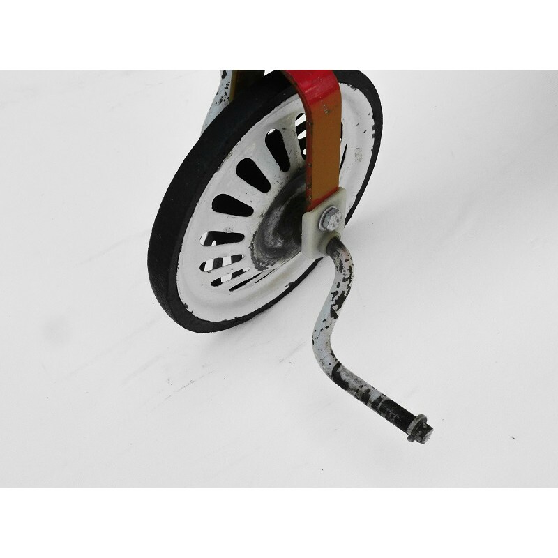 As rodas dianteiras são diferentes das traseiras, acreditamos que a dianteira seja original e as traseiras de algum outro triciclo que foi adaptada